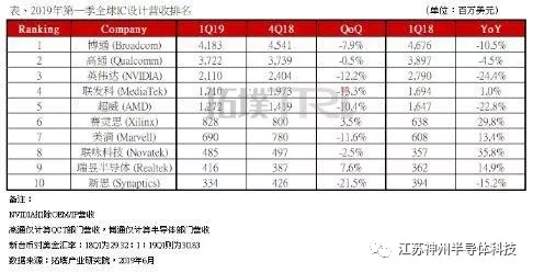 发布时间 : 2019-06-28 浏览次数 : 次日前,TrendForce 旗下的拓墣产业研究院发布了 2019 年第一季度全球前 10 大 IC 设计(Fabless)厂商的营收及排名。
